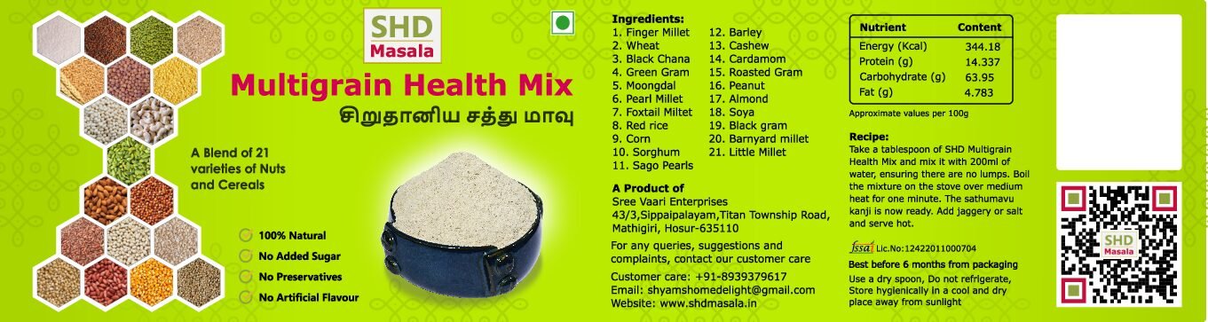 Recipe:Take a tablespoon of SHD Multigrain Health Mix and mix it with 200ml of water, ensuring there are no lumps. Boil the mixture on the stove over medium heat for one minute. Your Health Mix is now ready. Add jaggery or salt and serve hot.