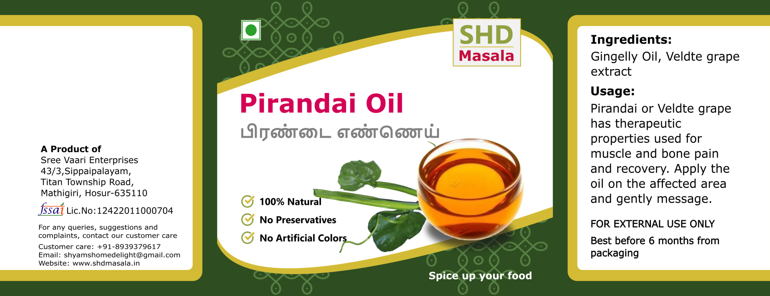 Application Method: Pirandai or Veldt grape has therapeutic properties traditionally used for muscle pain and recovery. Take a small amount of Pirandai Oil and apply to the affected area. Gently massage the oil into the skin using circular motions for better absorption.